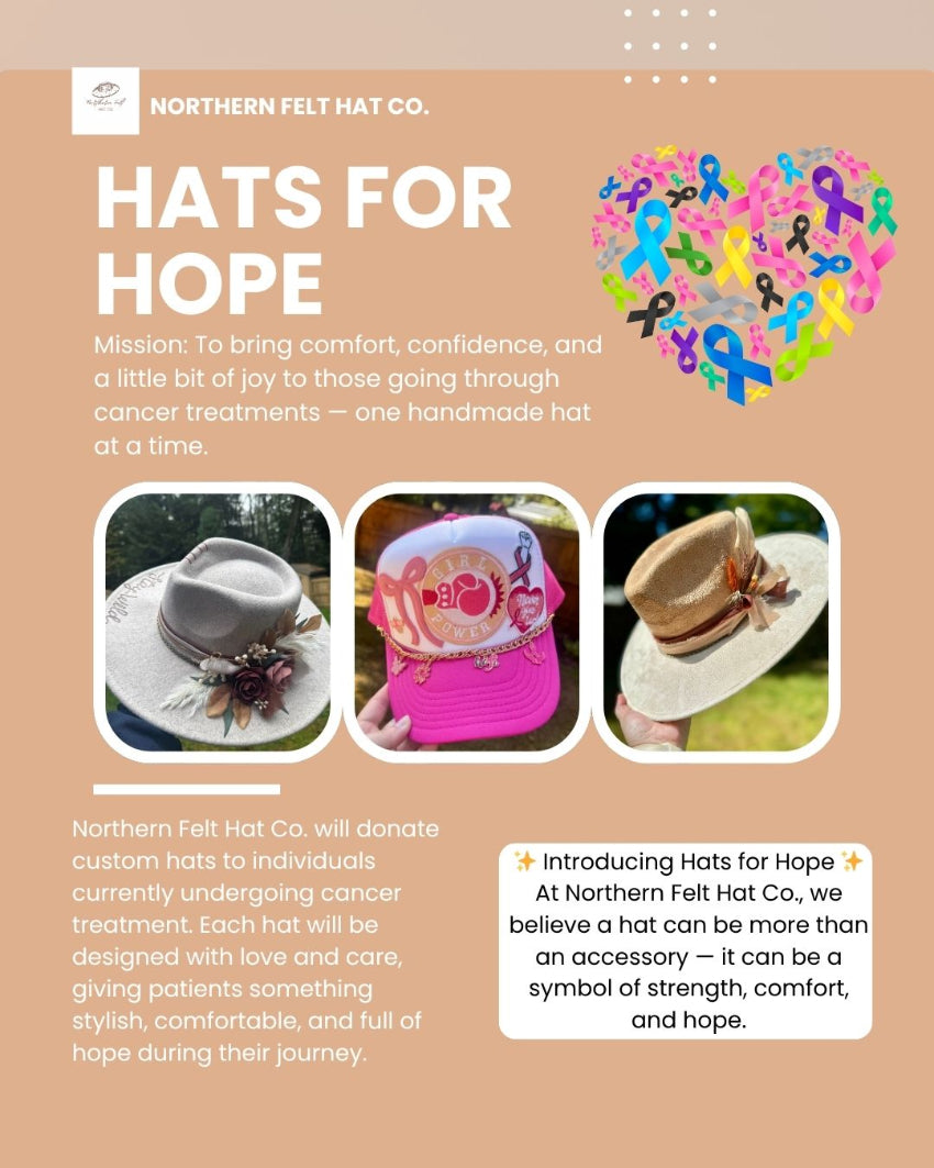 In honor of Breast Cancer Awareness Month, we are proud to launch Hats for Hope, a special initiative dedicated to bringing confidence and joy to those undergoing cancer treatment. Each custom hat is created with love and care, offering patients something stylish, comfortable, and uplifting during their journey.